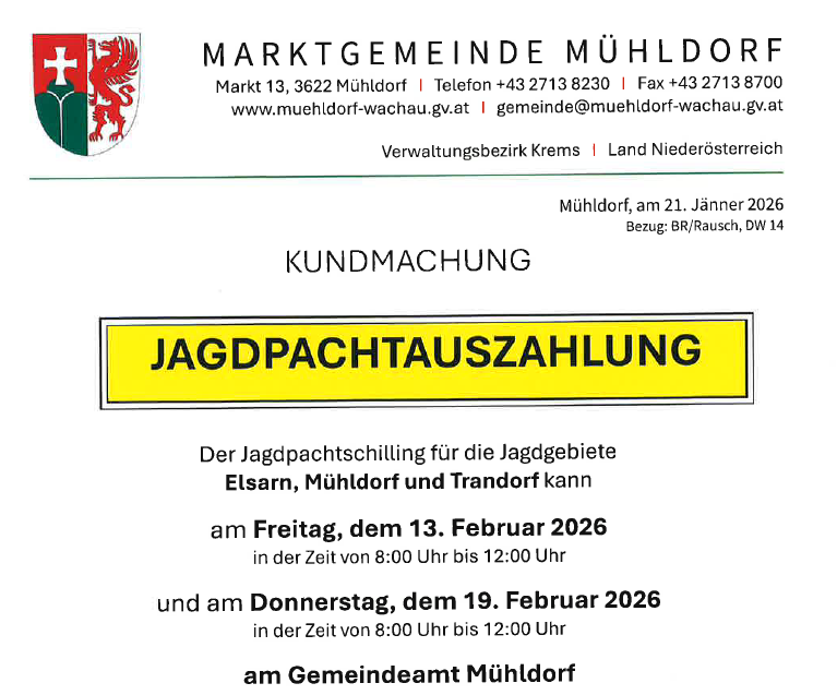 KUNDMACHUNG – Jagdpachtauszahlung 13. u. 19.02.2026/Marktgemeinde Mühldorf