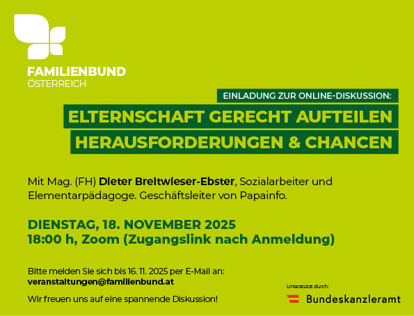Online-Diskussion: Elternschaft gerecht aufteilen – Herausforderungen & Chancen am 18.11.2025 um 18 Uhr / Familienbund Österreich
