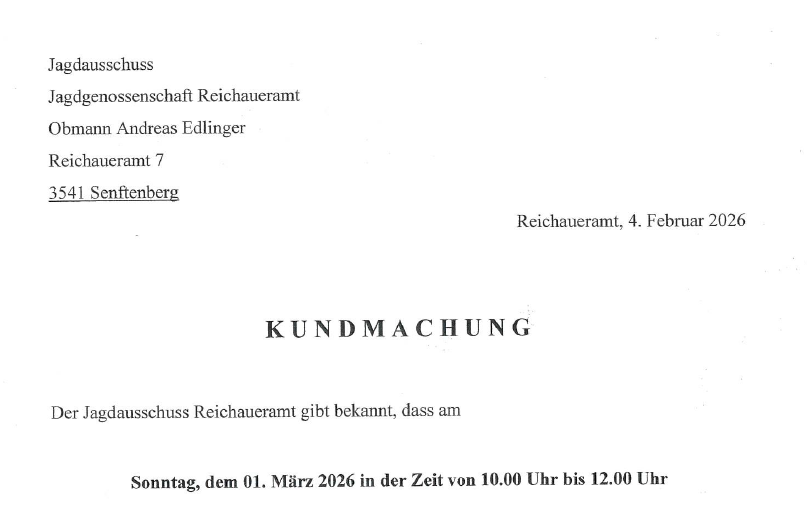 • KUNDMACHUNG – Auszahlung Jagdpacht Reichaueramt am Sonntag, den 01. März 2026 in Ostra