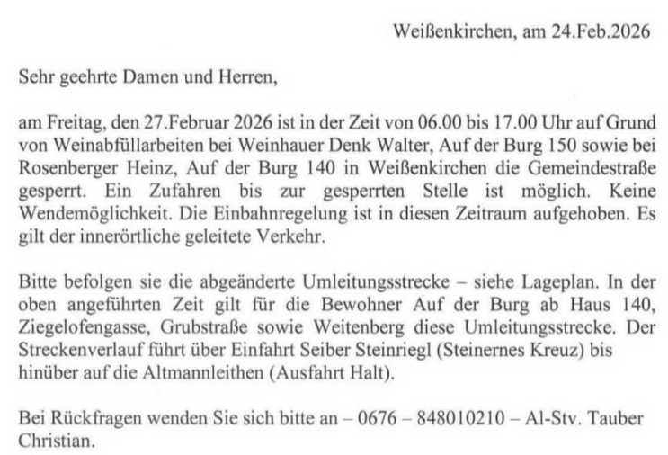 • SPERRE Gemeindestraße am Fr. 27.02.2026 von 6 – 17 Uhr / Marktgemeinde WEISSENKIRCHEN